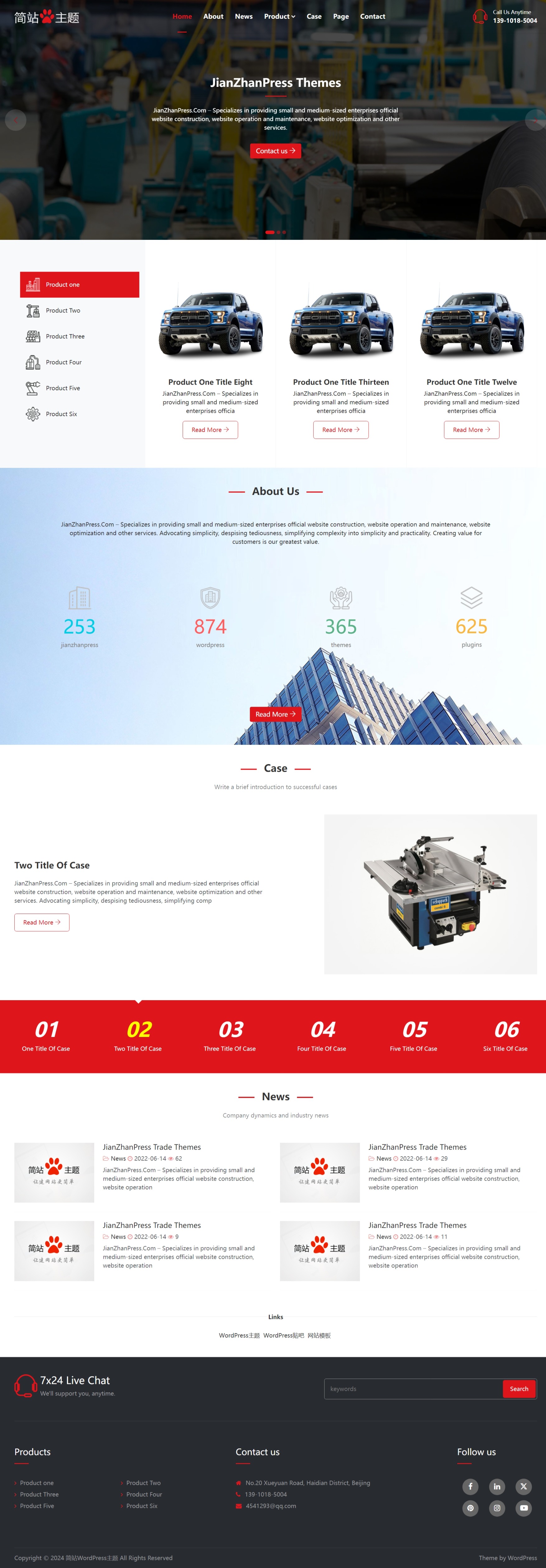 首页的设计简洁而不失大气,顶部导航栏清晰地展示了网站的主要栏目,包括首页(Home)、关于我们(About)、新闻(News)、产品(Products)、案例(Case)、页面(Page)和联系方式(Contact)。这种布局使得用户能够快速找到他们感兴趣的信息。